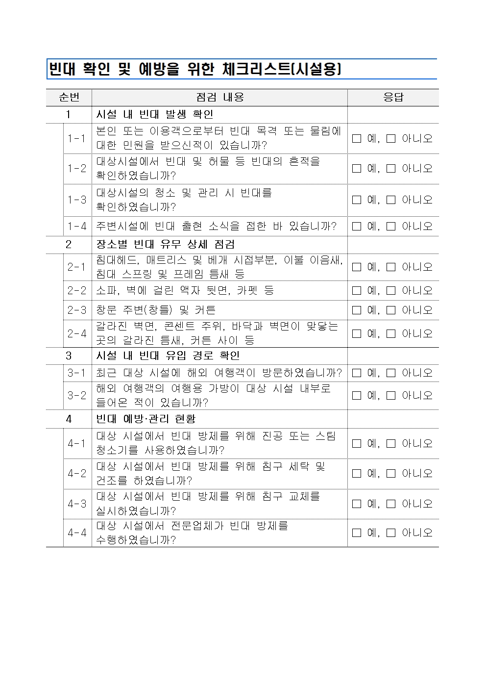 빈대 확인 및 예방을 위한 체크리스트(개인용,기관용)