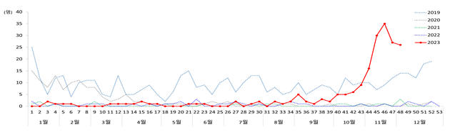 경기도 감염병 지원관리단의 통계에 따르면 2023년도 46주 누적 2,210명으로 전년도 동기간(2022년도 46주 누적 1,038명) 대비 2.1배 증가하였으며, 코로나 유행 이전 2019년도 동기간(3,637명) 대비 60.7%로 낮은 수준 발생하였다고 합니다.
