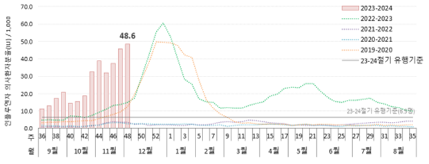 올해 인플루엔자(독감) 유행은 지난해 9월부터 시작되어 1년 2개월 이상 유행주의보 해제없이 연중 유행 중으로, 12월 1주(’23.11.26.∼12.2.) 현재 외래 1 천명당 48.6명으로 예년 대비 이른 겨울철 증가세*를 보이고 있다고 합니다.