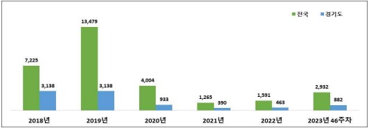 경기도 감염병 지원관리단의 통계에 따르면 2023년도 46주 누적 2,210명으로 전년도 동기간(2022년도 46주 누적 1,038명) 대비 2.1배 증가하였으며, 코로나 유행 이전 2019년도 동기간(3,637명) 대비 60.7%로 낮은 수준 발생하였다고 합니다.