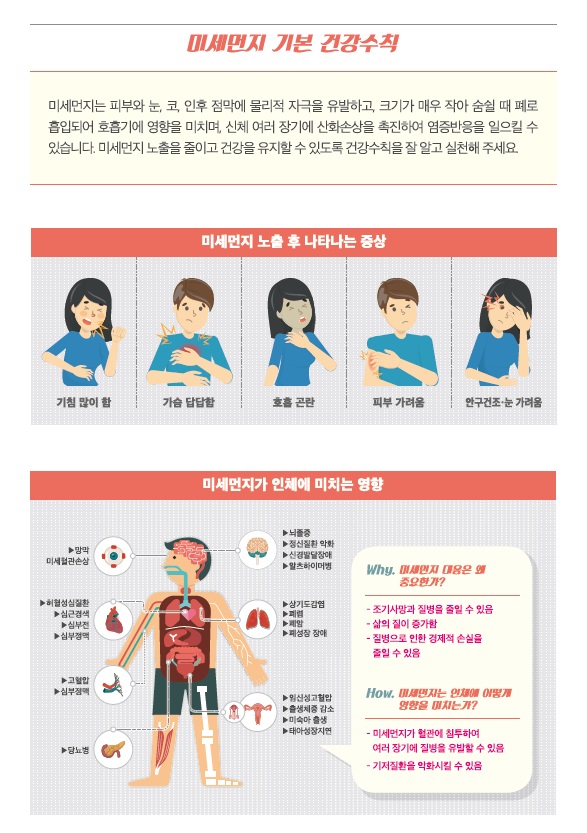 미세먼지는 피부와 눈, 코 등에 물리적 자극을 유발하고 크기가 매우 작아 미세먼지에 노출될 시, 폐로 흡입되어 호흡기에 영향을 미치며 신체 여러 장기에 염증반응을 촉진하여 좋지 않은 영향을 미칠 수 있습니다. 이번 시간에는 미세먼지와 미세먼지 민감군별 건강수칙을 알아보도록 하겠습니다.